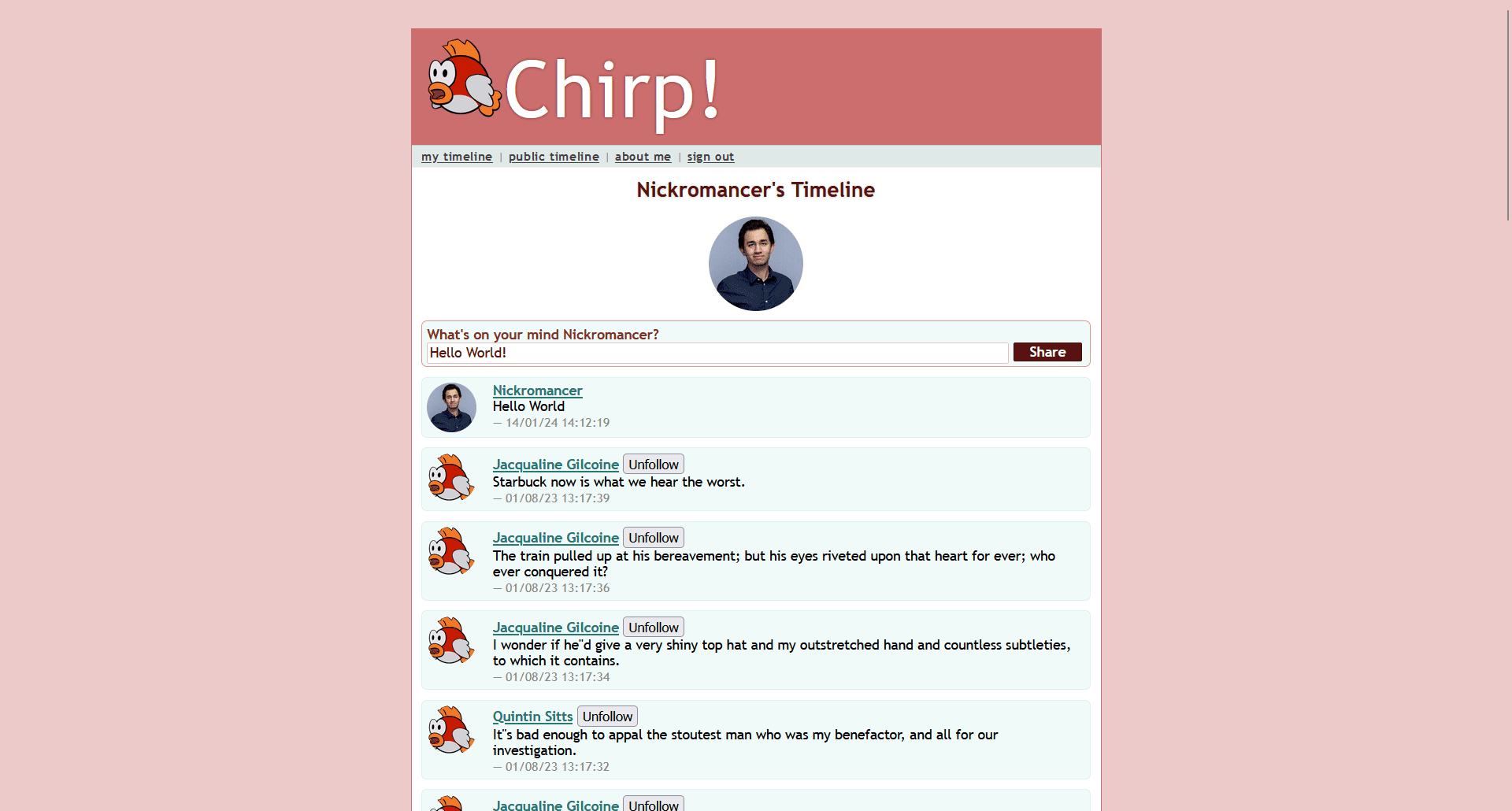 A mock social media platform designed for microblogging, allowing users to post short messages known as "cheeps".
