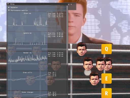 Using the SimpleRenderEngine (SRE), I extended the engine with a game loop synced with a music track and matching the BPM of a song. This was simulated in a rhythm game using Rick Astley's classic songs, with lanes containing nodes that the player needed to hit on time.